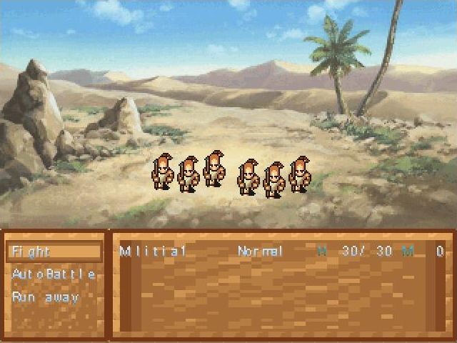 Hitting the cancellation key on any maps will bring up the menu. On the right, you will see the units in your army. Each unit has the following stats: L (level - unimportant), H (health - how many men this unit holds), Ex (experience - unimportant) and M (magic - unimportant) On the left, you will see more menu options: Item (which lists any items that in your army that are not currently equiped), Tech Skill (RPG Maker 2000's magic system- unimportant), Equipment (where you can change the equipment of your units), Save Game, and End Game (which will take you back to the intro menu)