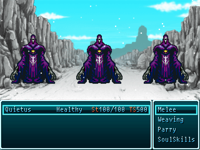The game uses a custom battle system that includes using souls of the defeated enemies to create consumables or power the special moves of the characters. The system isn't really very complex (and the author optionally pops in giving advices and explanations on the mechanics introduced) but requires some planning and strategy. Battles require in fact to find and exploit the opponent's weakness rather than just attacking with the most powerful move. Visuals are simple but the setting and music are mysterious and evocative. A game that stands out for sure.