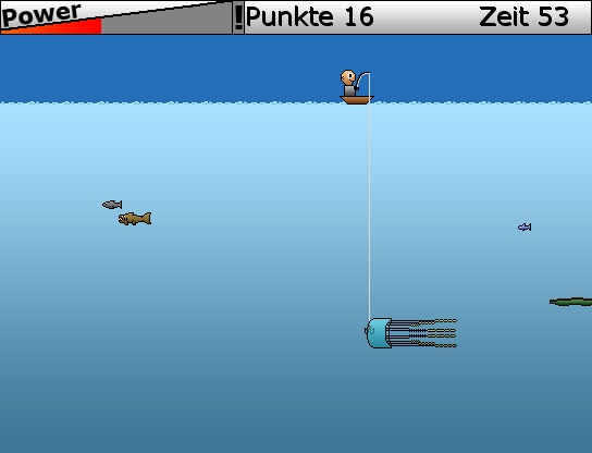 Wenn der Fisch angebissen hat, muss man ihn mit der Pfeiltaste nach oben ins Boot befördern. Sobald er oben am Boot ist, ist er gefangen. Aber Achtung! Durch einziehen der Angelschnur nimmt die Belastung der Angel zu, die Power Anzeige wird höher. Der Fisch am Haken zeiht selber auch, wodurch die Power-Anzeige auch zunimmt. Sobald die Power Anzeige im |!| Feld ist, und prall gefüllt ist, ist die Belastung zu hoch, und der Fisch reißt sich los. Auch wenn der Fisch ganz unten am Bildschirm angelangt ist, wird er sich befreien. Die Kunst ist daher, die Fische so schnell wie möglich (es geht ja nach Zeit das Spiel) zu fangen, ohne dass sie reißaus nehmen. Im Spiel werdet ihr merken das größere Fische meist mehr Kraft und Durchhalte vermögen als die kleinen haben.