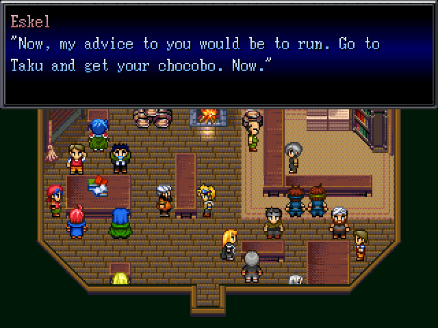 Trilin is a lecherous adventure on the run after he went to bed with the daughter of the local lord, so he goes to meed Taku, a man who raises chocobos. One of these can take him far from this country, anyway after going hunting the chocobo breeder discovers that a group of man has kidnapped his family and his chocobos! Trilin and a Moogle will join him!